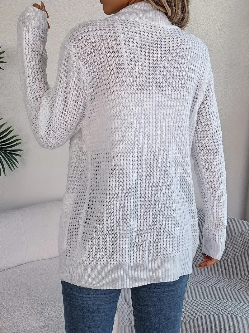 Ce cardigan tricoté est le choix parfait pour celles qui souhaitent rester stylées tout en étant à l’aise. Sa texture douce et sa coupe fluide en font un incontournable pour compléter vos tenues d’automne et d’hiver.