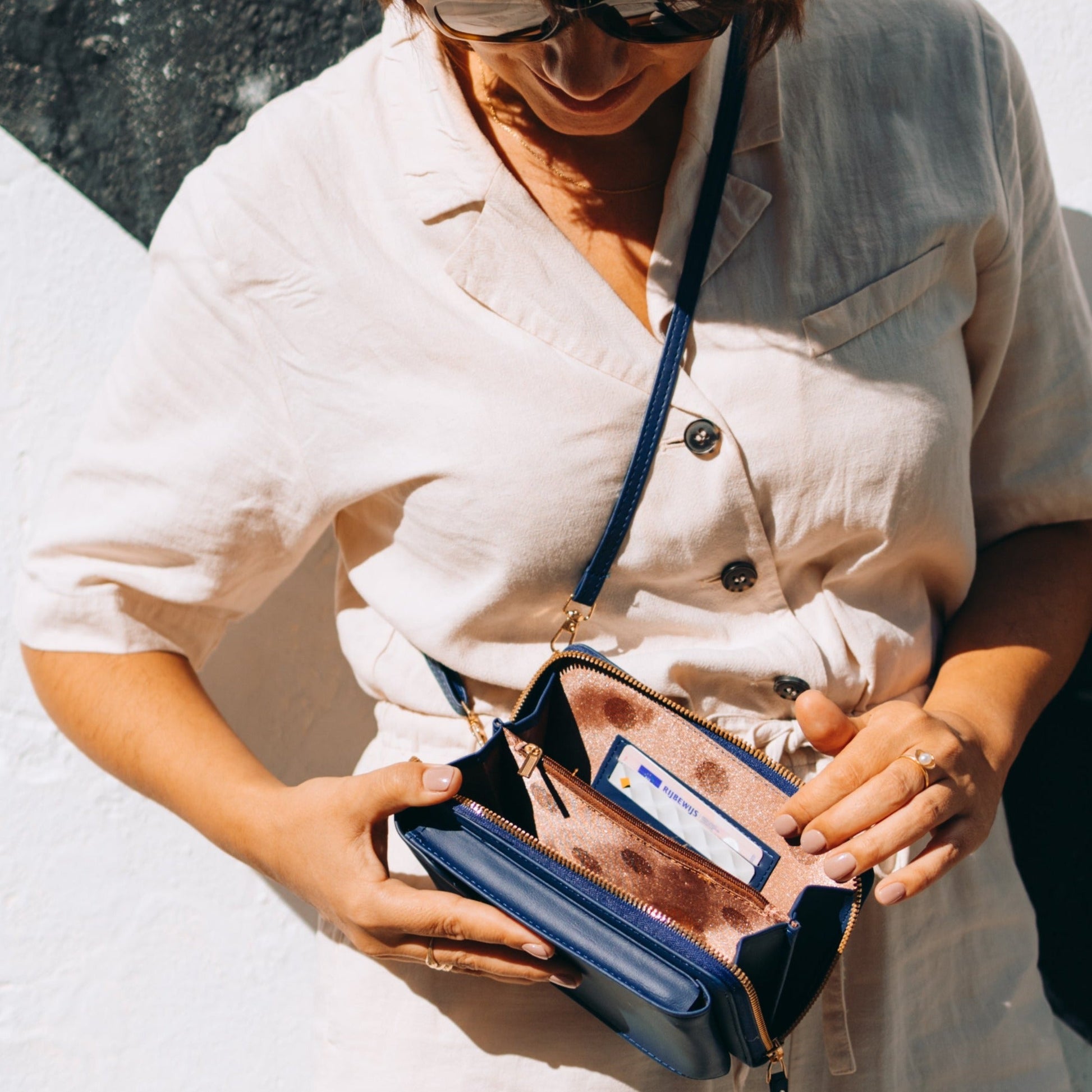 Il dispose d'une poche externe avec un bouton poussoir pratique, pour ranger votre téléphone portable en toute sécurité. La pochette By Selena s'adapte aux téléphones portables de toutes tailles.