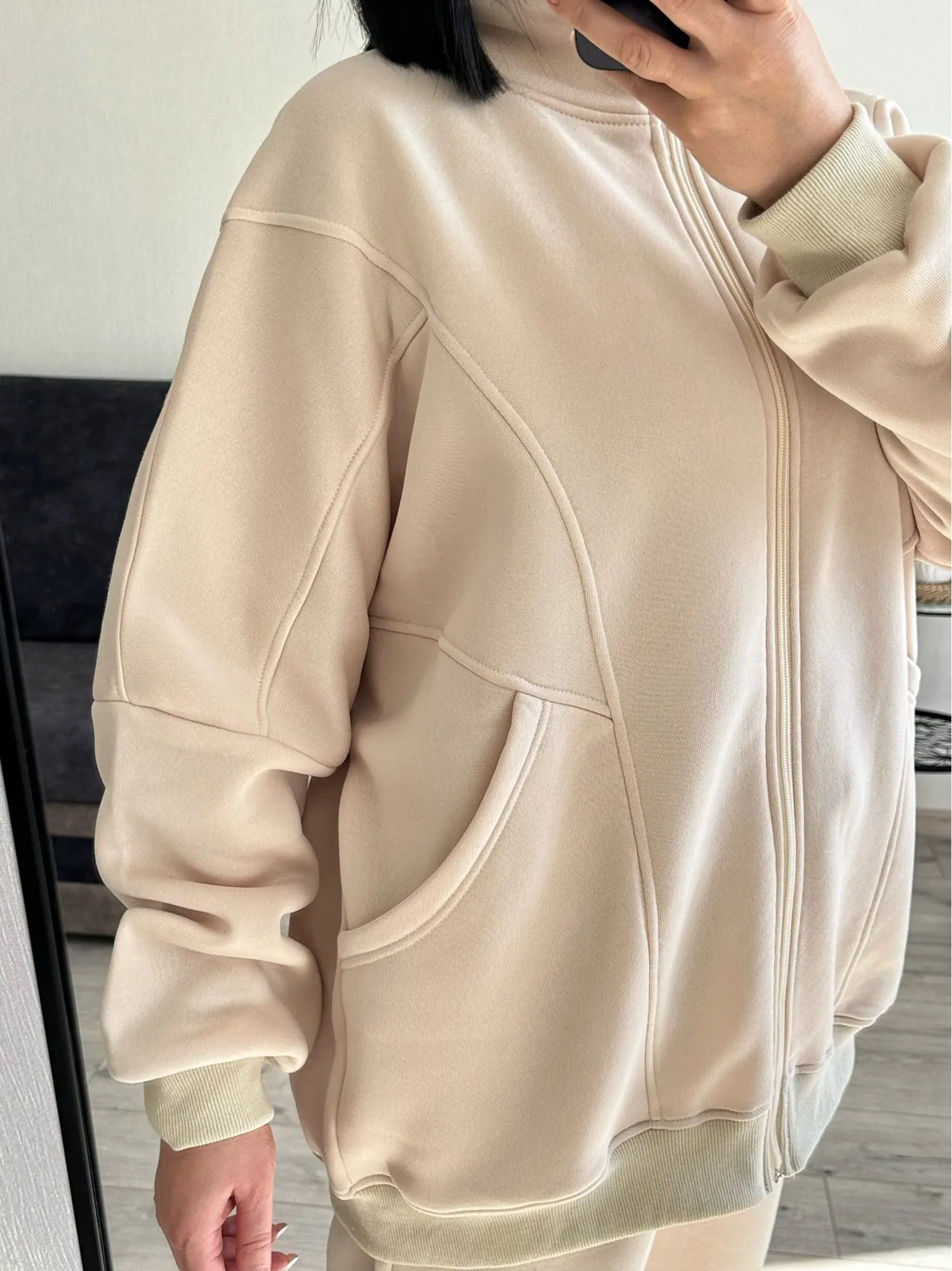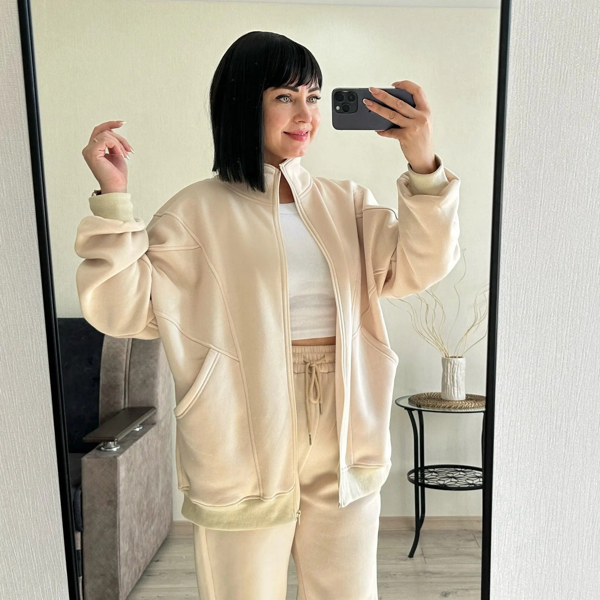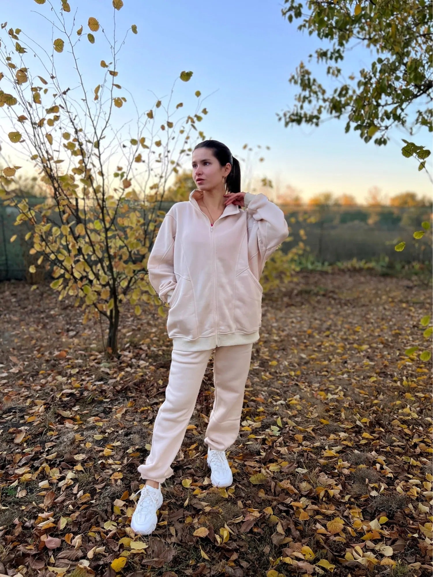 Cet ensemble se compose d'une veste zippée élégante et d'un pantalon ample à taille élastique, créant la tenue parfaite pour vos journées détente ou vos sorties en ville.