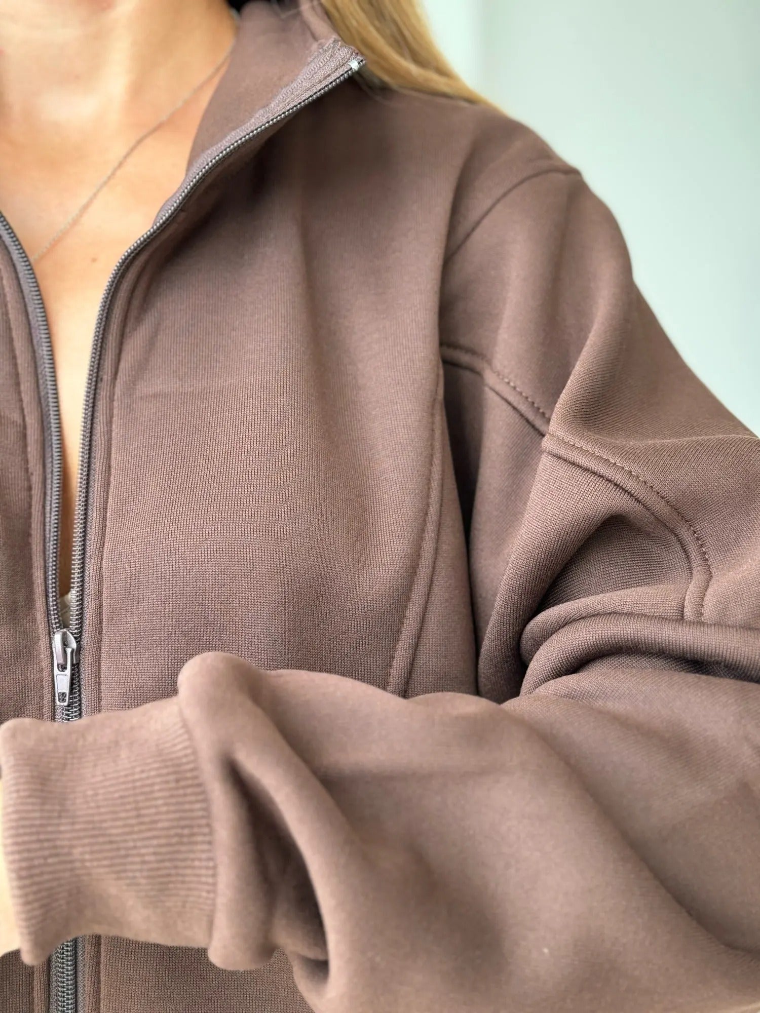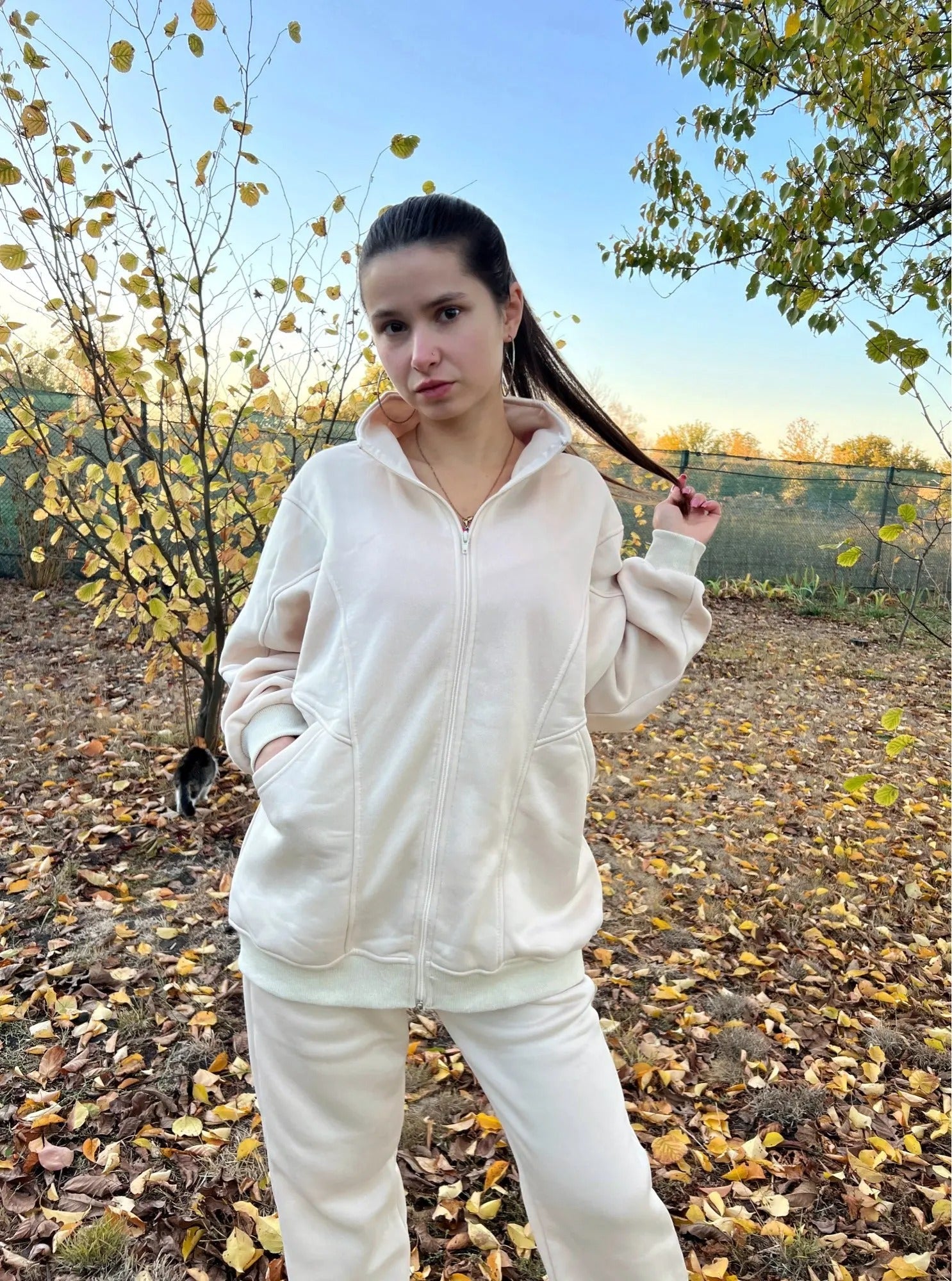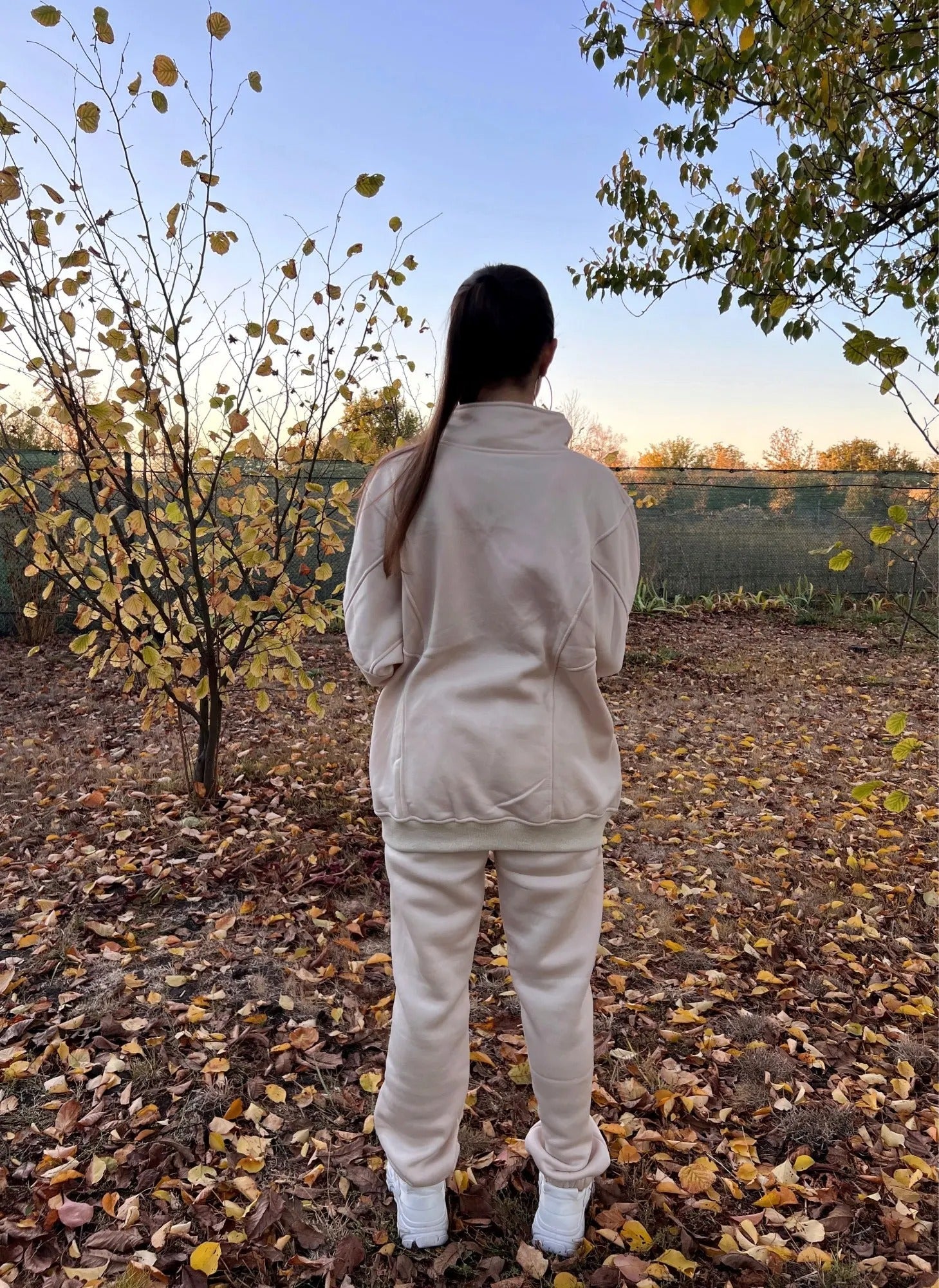 Cet ensemble se compose d'une veste zippée élégante et d'un pantalon ample à taille élastique, créant la tenue parfaite pour vos journées détente ou vos sorties en ville.